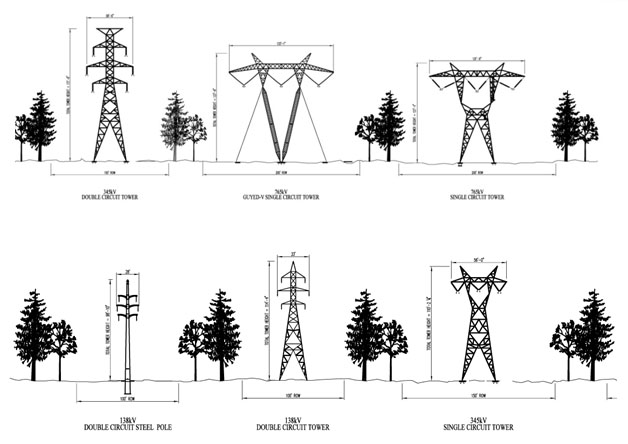 - Overhead transmission towers including 750 kV multiple circuit lines.