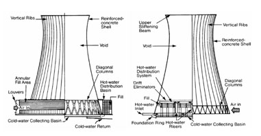The natural draft or hyperbolic cooling tower makes use of the difference in temperature between the ambient air and the hotter air inside the tower. As hot air moves upwards through the tower (because hot air rises), fresh cool air is drawn into the tower through an air inlet at the bottom. Due to the layout of the tower, no fan is required and there is almost no circulation of hot air that could affect the performance. Concrete is used for the tower shell with a height of up to 200 m. These cooling towers are mostly only for large heat duties